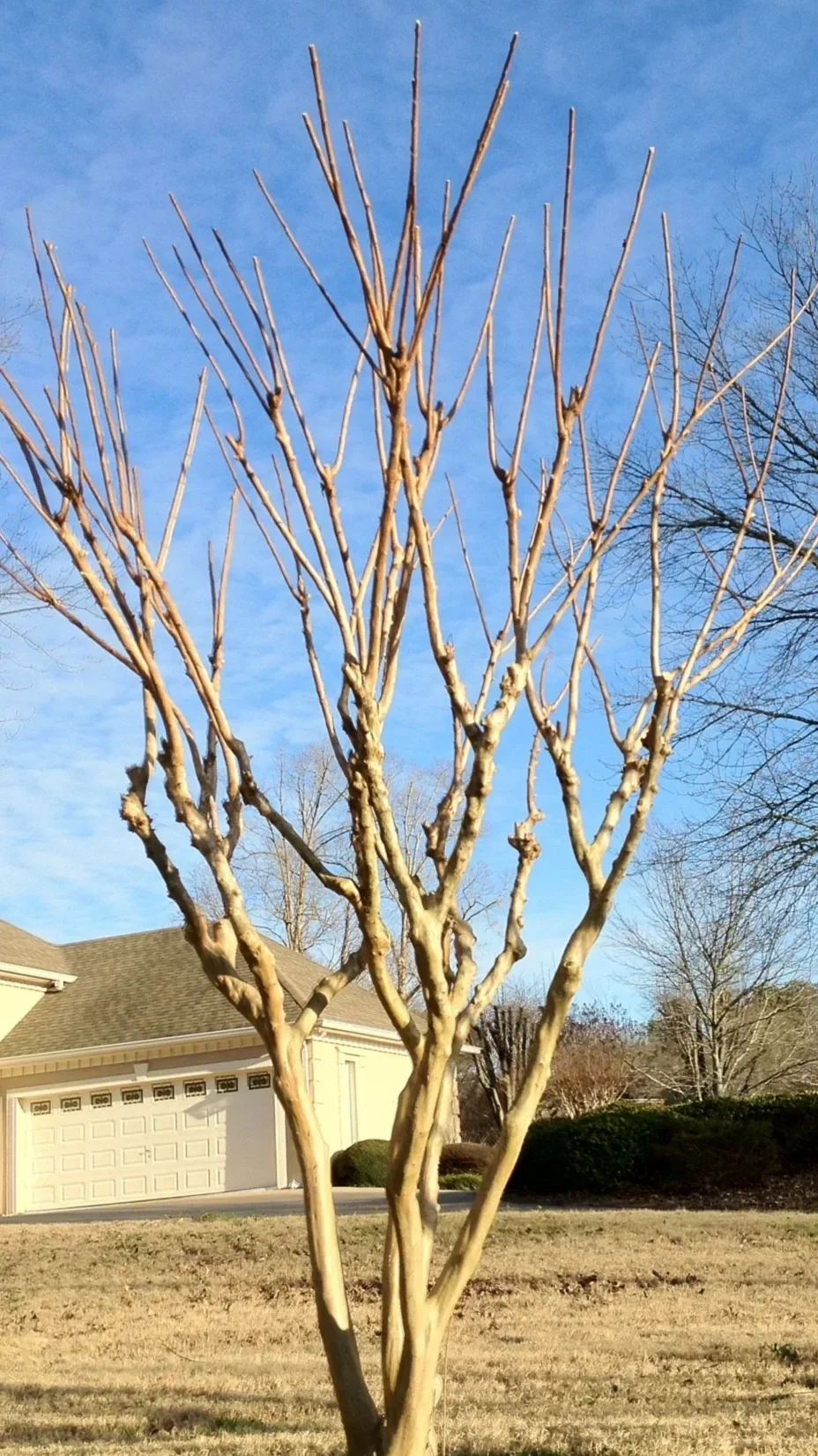 Crape Myrtle pruned correctly in the winter. Notice this tree does not have buds and thus blooms on new wood.